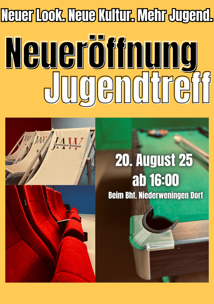 Das Alltagsleben im Jugendtreff wird bereichert durch verschiedene Events, bei denen die Jugendlichen feiern können, sich einbringen können und neues kennenlernen dürfen. Die Events werden grundsätzlich vom Jugi-Team unter Mithilfe der Jugendlichen organisiert. Eigene Ideen und Verbesserungsvorschläge der Jugendliche oder deren Eltern sind dabei explizit erwünscht. Klicke auf die Poster, um mehr über kommende und vergangene Events zu erfahren!